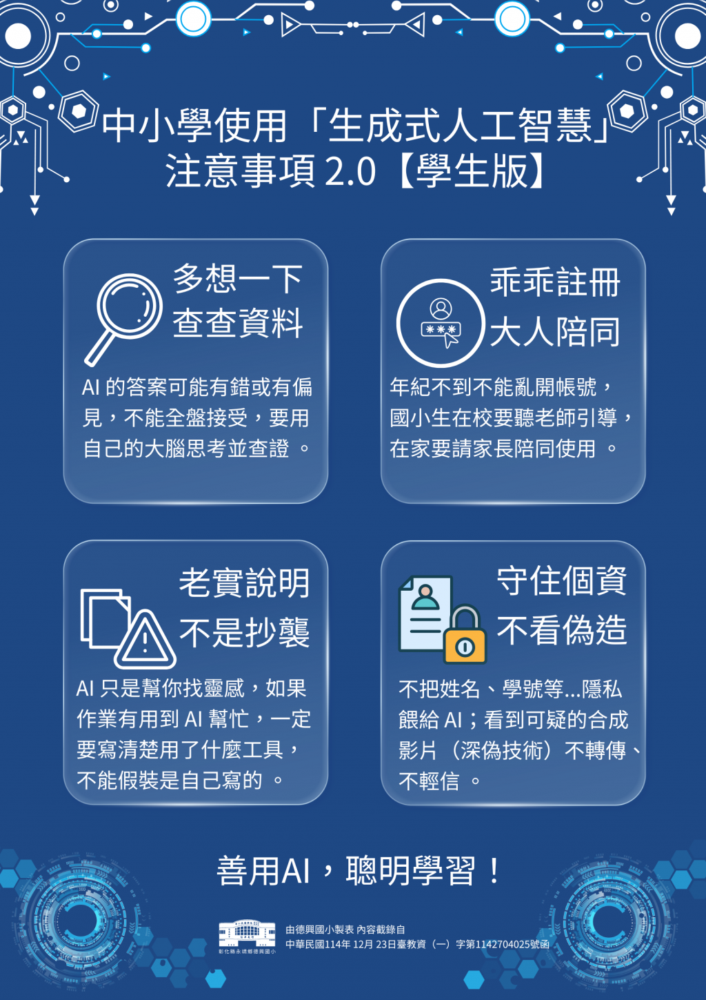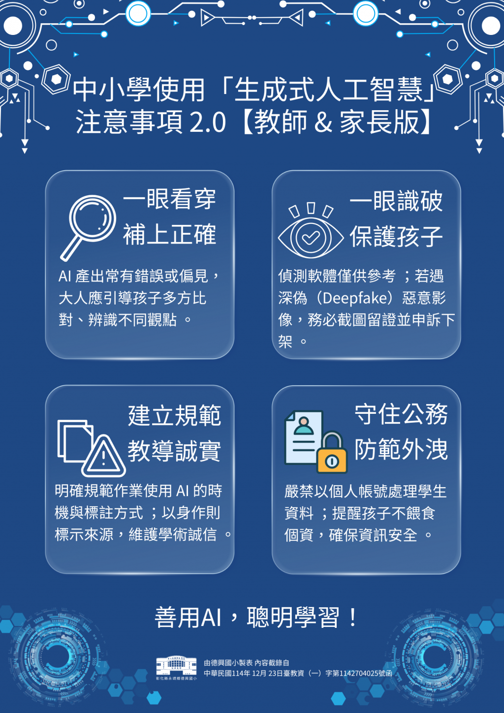 | 二、 | 為協助中小學教師、行政人員、家長及學生瞭解「生成式人工智慧」工具使用素養及使用的倫理原則,同時能在教師或家長的指導與同意下遵守各工具適齡與帳號申請規範,爰提供「中小學使用生成式人工智慧注意事項2.0(教師、行政人員及家長版)」及「中小學使用生成式人工智慧注意事項2.0(學生版)」。 |